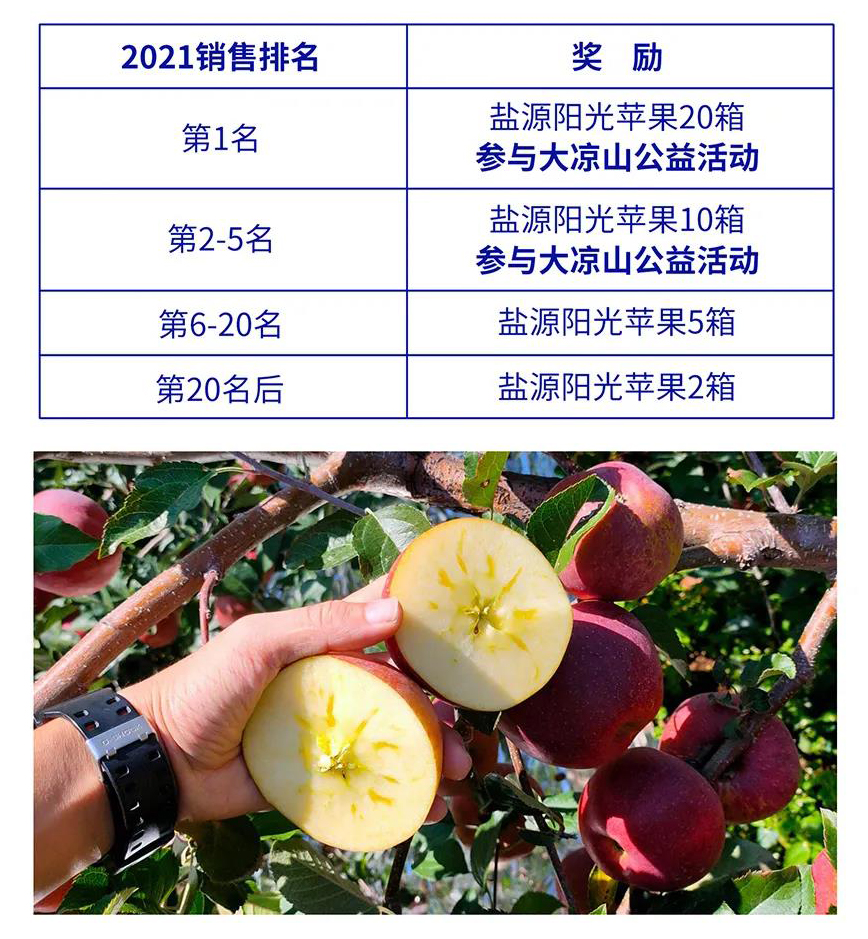 凡在2021年1月1日至2021年9月30日期間,有交易記錄的普愛(ài)會(huì)員,按照銷(xiāo)售排名可領(lǐng)取不同數(shù)量的鹽源陽(yáng)光蘋(píng)果。(以全款到賬時(shí)間結(jié)算)